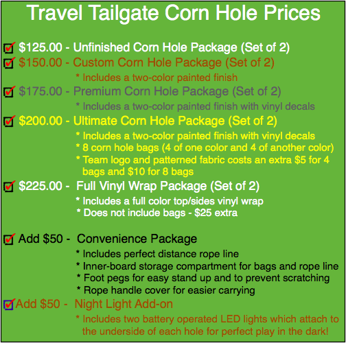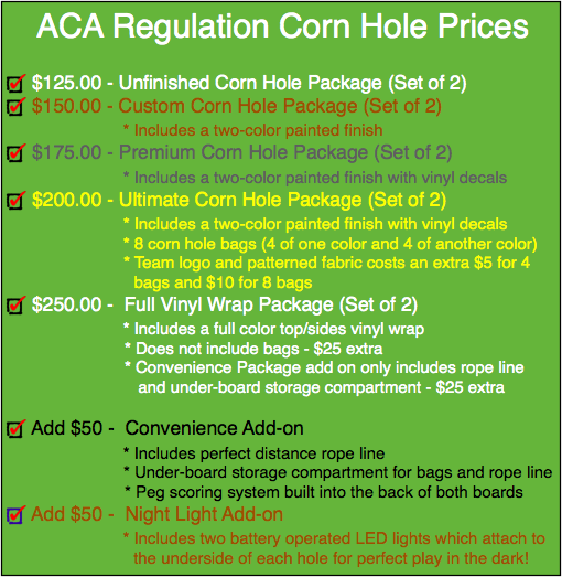 Regulation Cornhole sets now available in lightweight 1″x4″ frame construction.